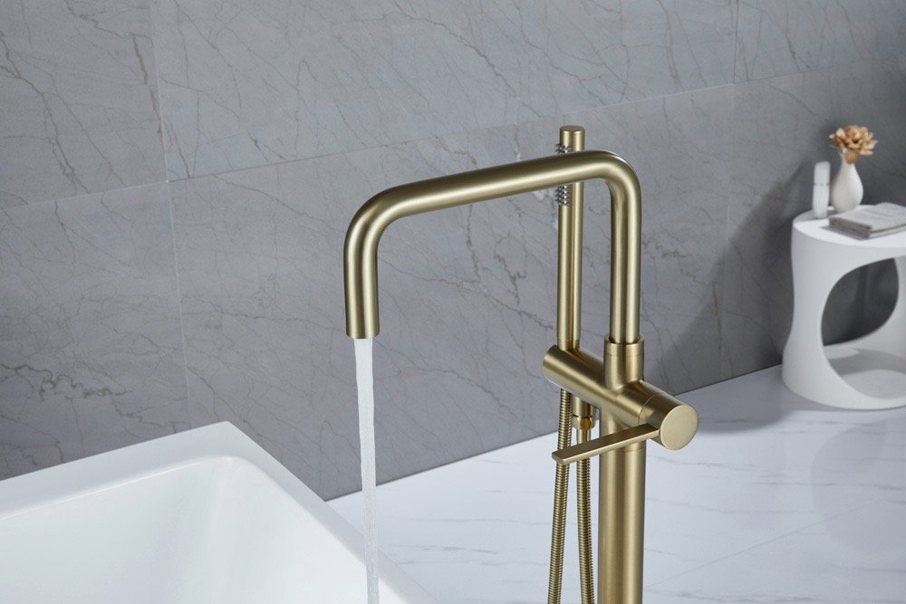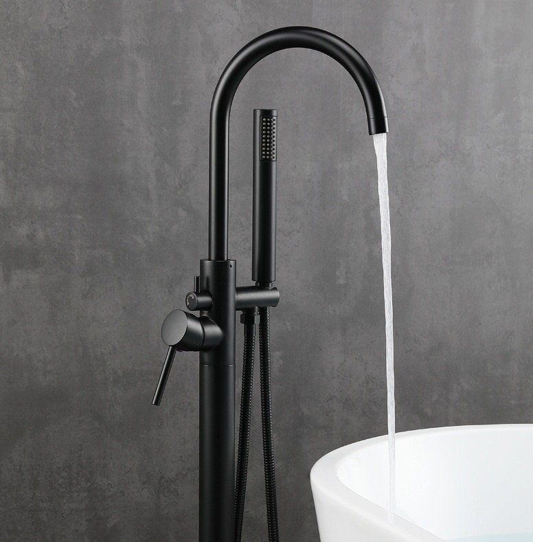 Floor-mounted freestanding installation creates a striking visual centerpiece in the bathroom — no wall connections required, just clean lines rising from the floor.